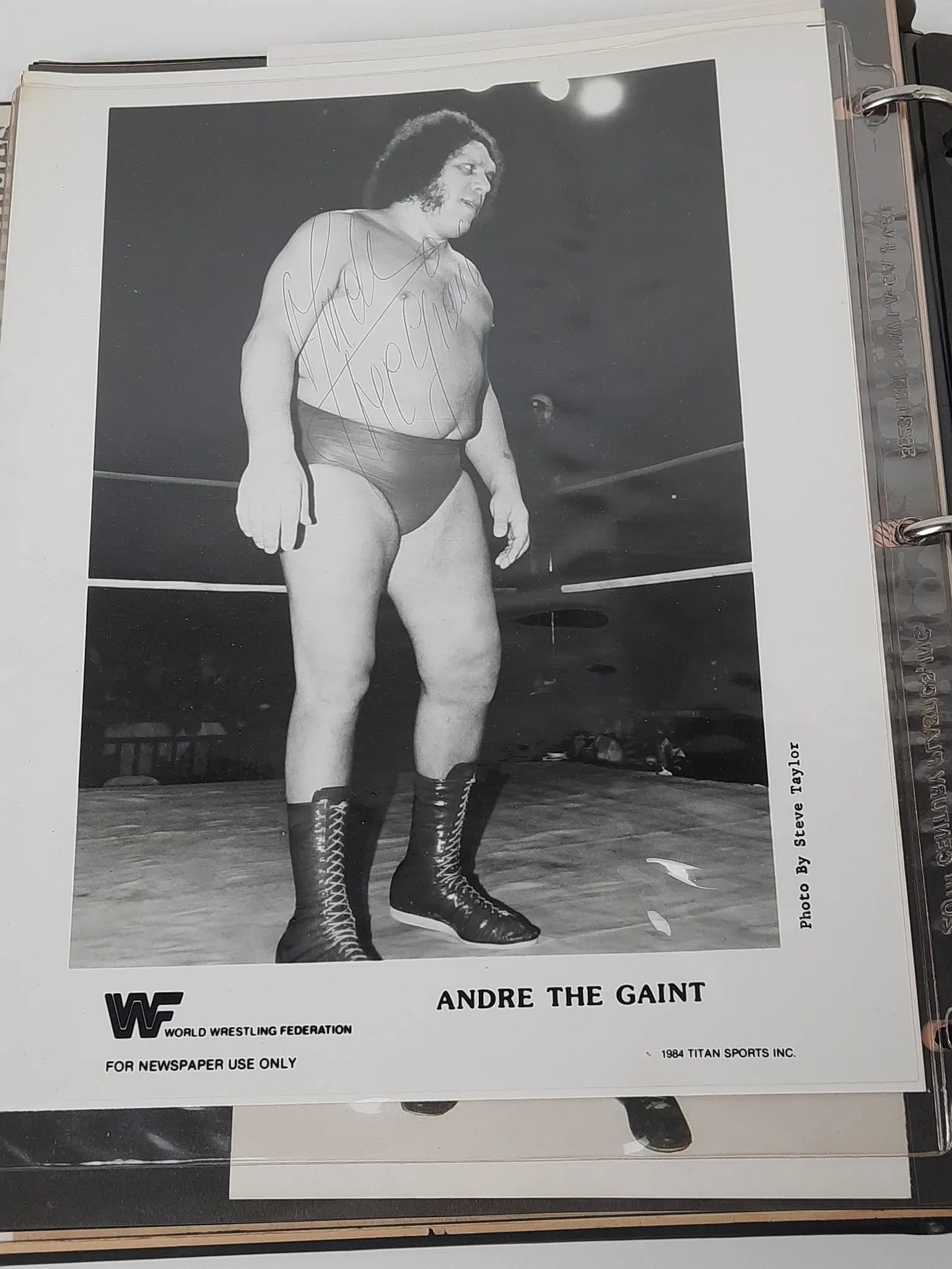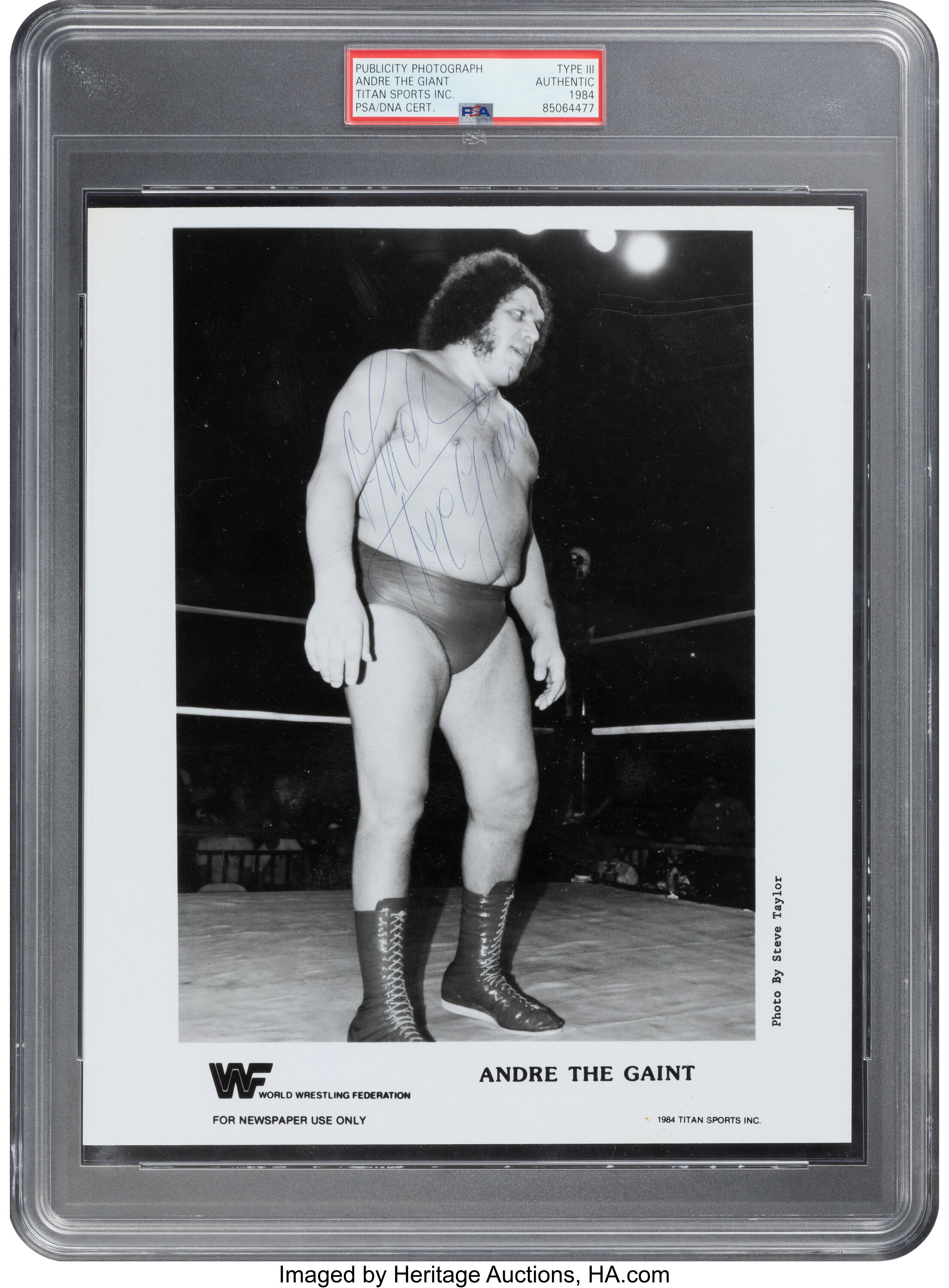Just two years later, the standout item from that lot—a 1984 Andre the Giant Signed Publicity Photograph by Steve Taylor—returned to the market. Now professionally authenticated as a PSA/DNA Type 3, it was no longer just a "photo in a binder". It was a piece of authenticated wrestling royalty.